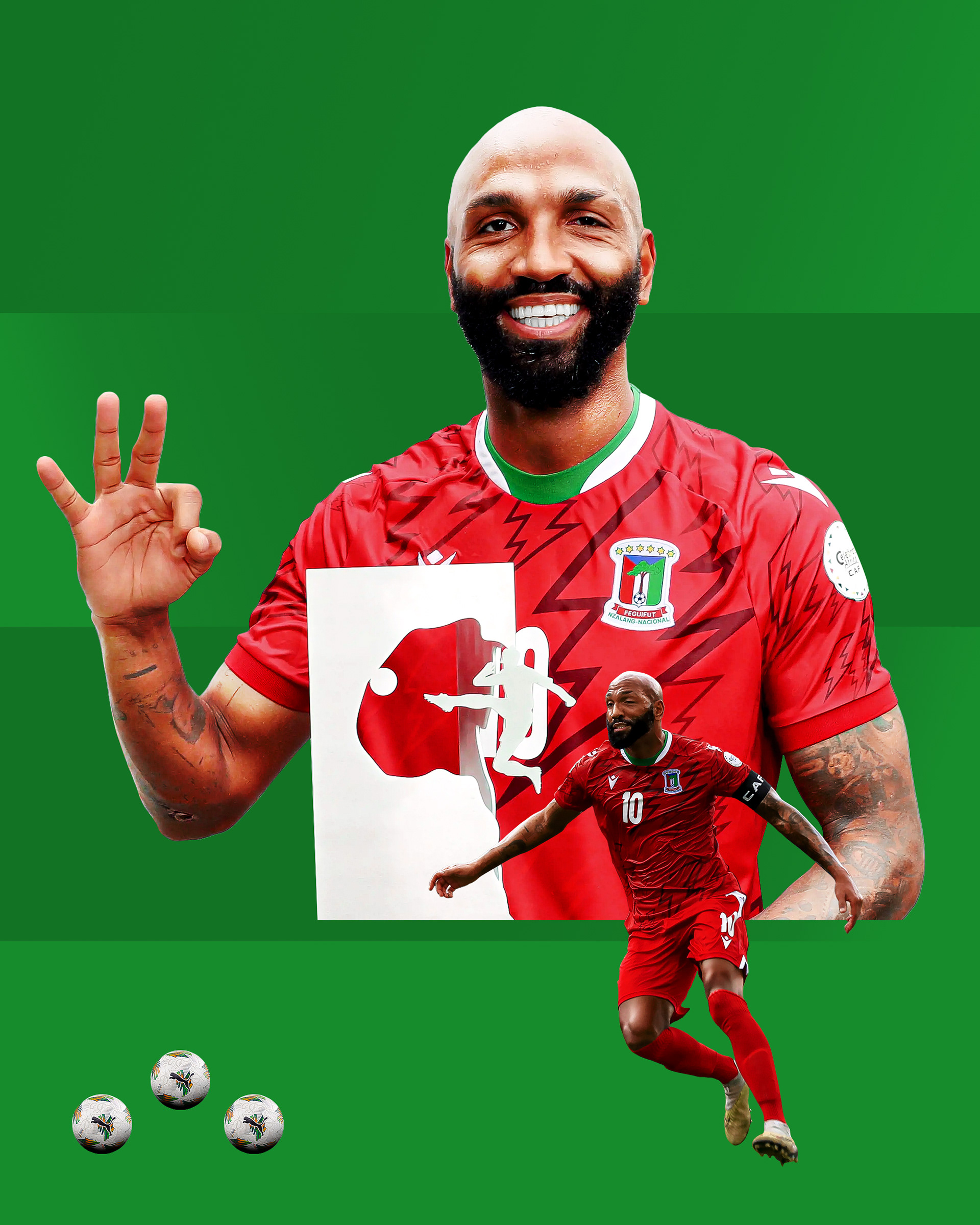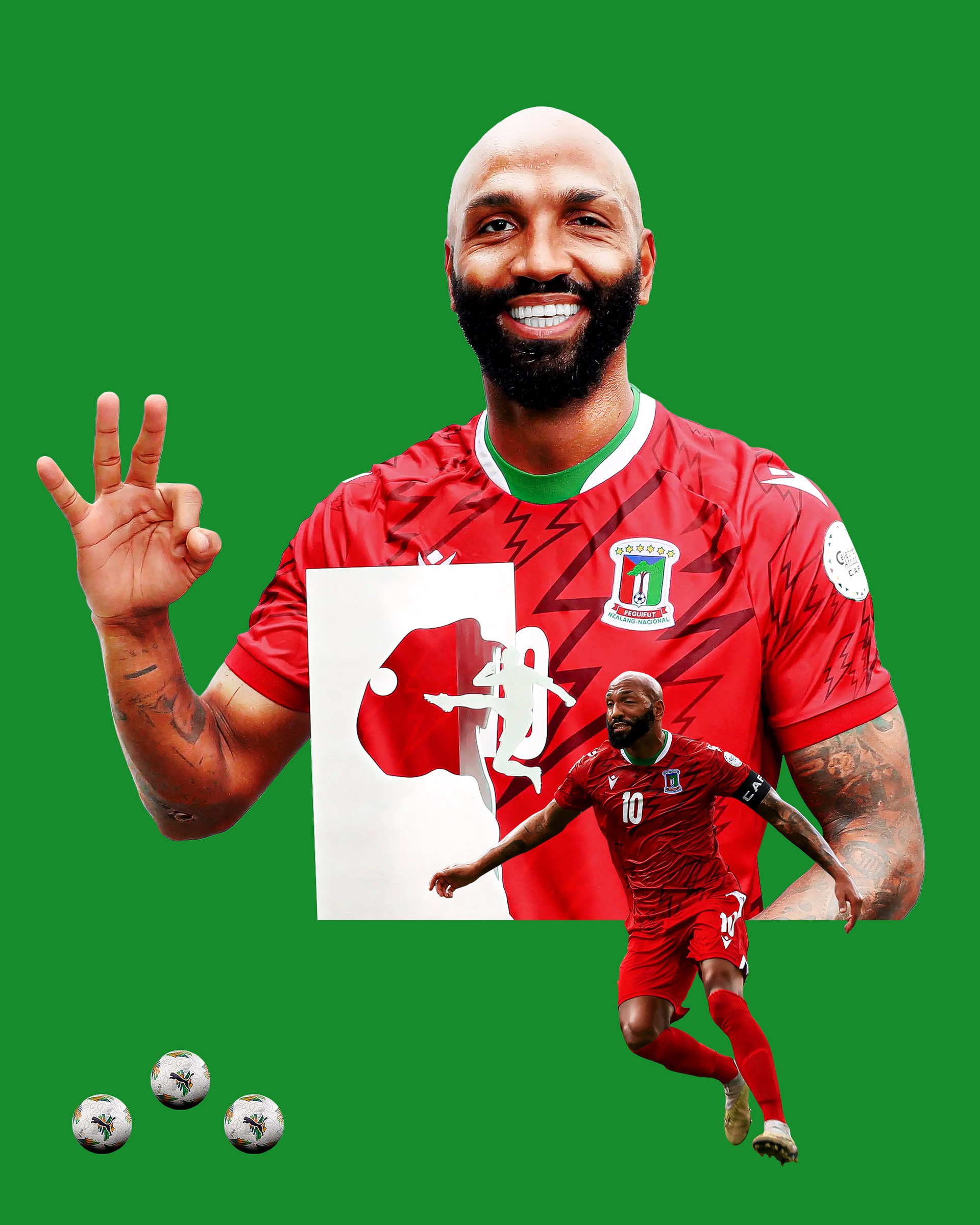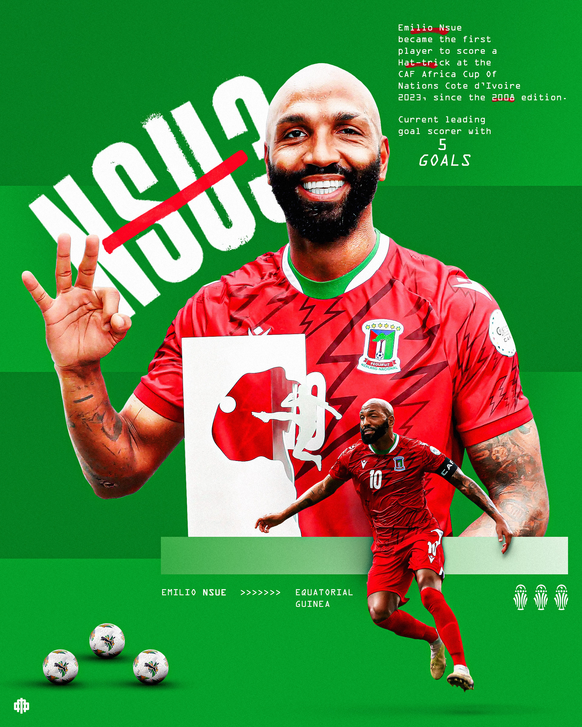 A clean, but visually appealing social media graphic of football player, Emilio Nsue. Placing the large image of him as the main graphic with supporting elements, creates hieracrchy and visual interest. The colours used were to tie in with the kit.